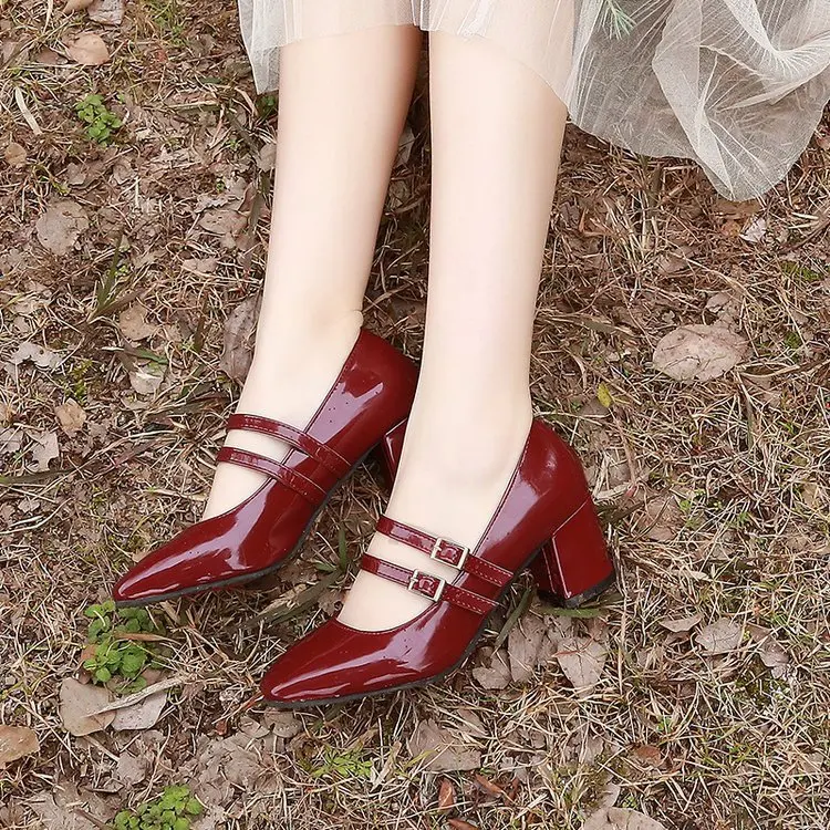 Women Double Buckle Mary Janes Patent Leather Dress Shoes High Heels Pumps Retro