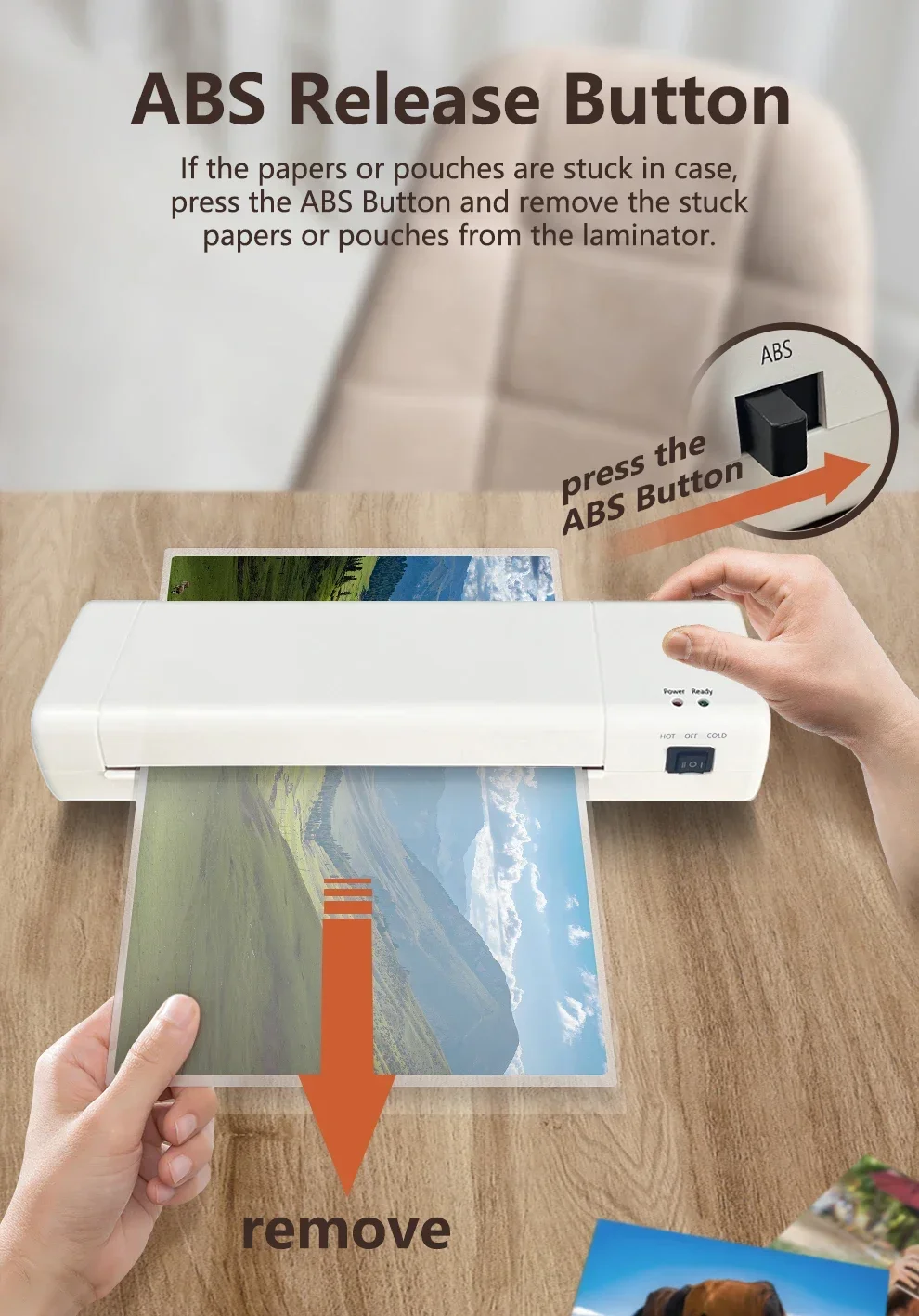 ABS Function for Removal: Equipped with ABS Jam Release System, you can draw out the paper easily via the "Jam-Release" button when paper jams, It is very important to ensure the safety of your files and extend the life of the machine. It can laminate 9 inches wide items to meet your needs.