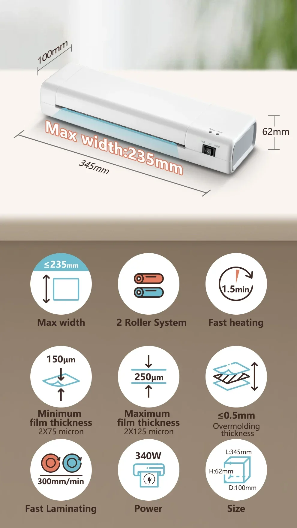 Portable, Suitable for Home/Office/School: Simple operation, compact size, and ultra-light laminator become ideal for individuals, teachers, business white-collar workers, often used to save important documents and precious photos (training materials, legal documents, posters, photos, menus, postcards, bookmarks, tags, children's artwork, etc.)