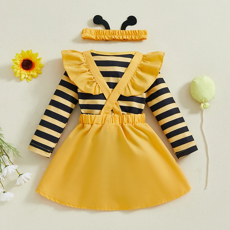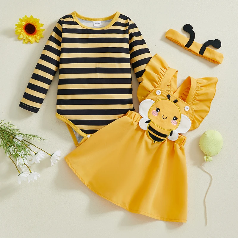 Baby Girls Autumn Skirt Sets Flying Sleeve Romper Bee/Beetle Embroidery Suspender Dress Headband Sets