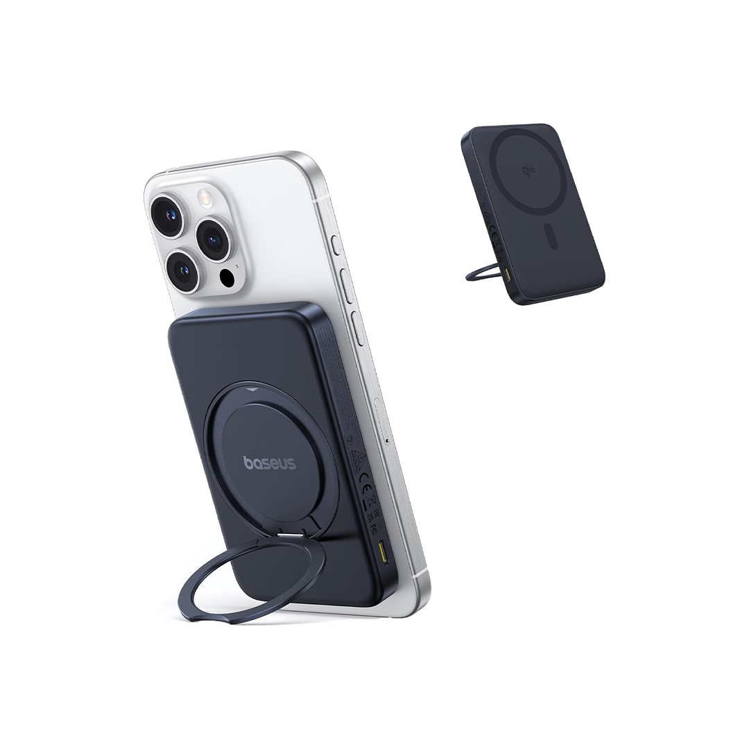 Ultra-slim, Qi2-certified MagSafe charger with 15W fast wireless charging, 20W USB-C port, and a 360° rotatable stand for hands-free use. Perfect pocket-sized companion for iPhone users on the go.