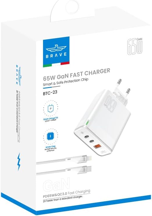 Compact 3-port charger with 2 USB-C PD ports and 1 USB-A QC port, delivering up to 65W fast charging for laptops, smartphones, and tablets with advanced safety protections.