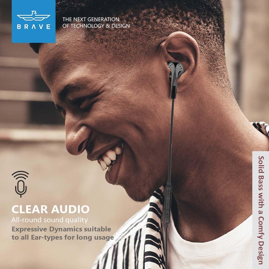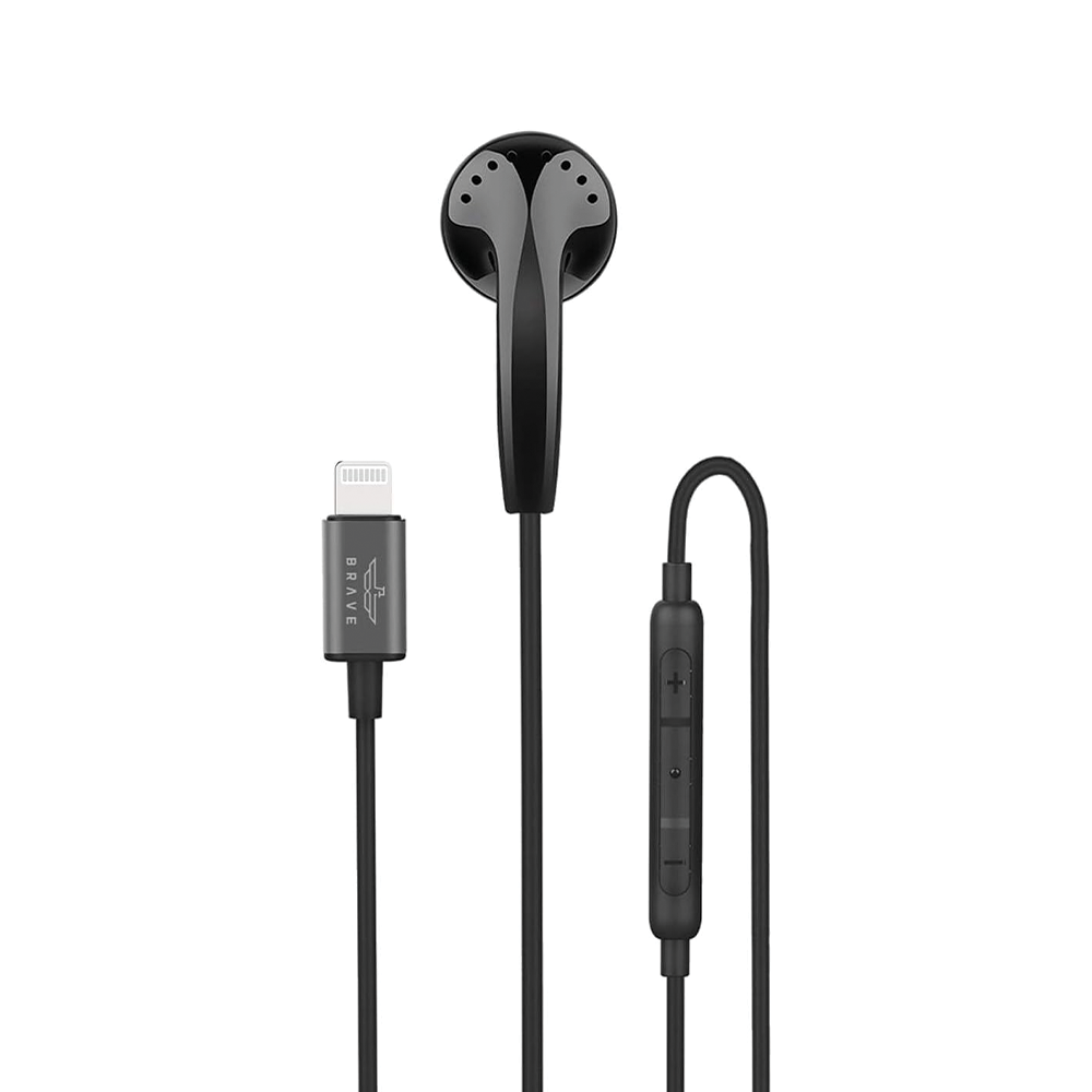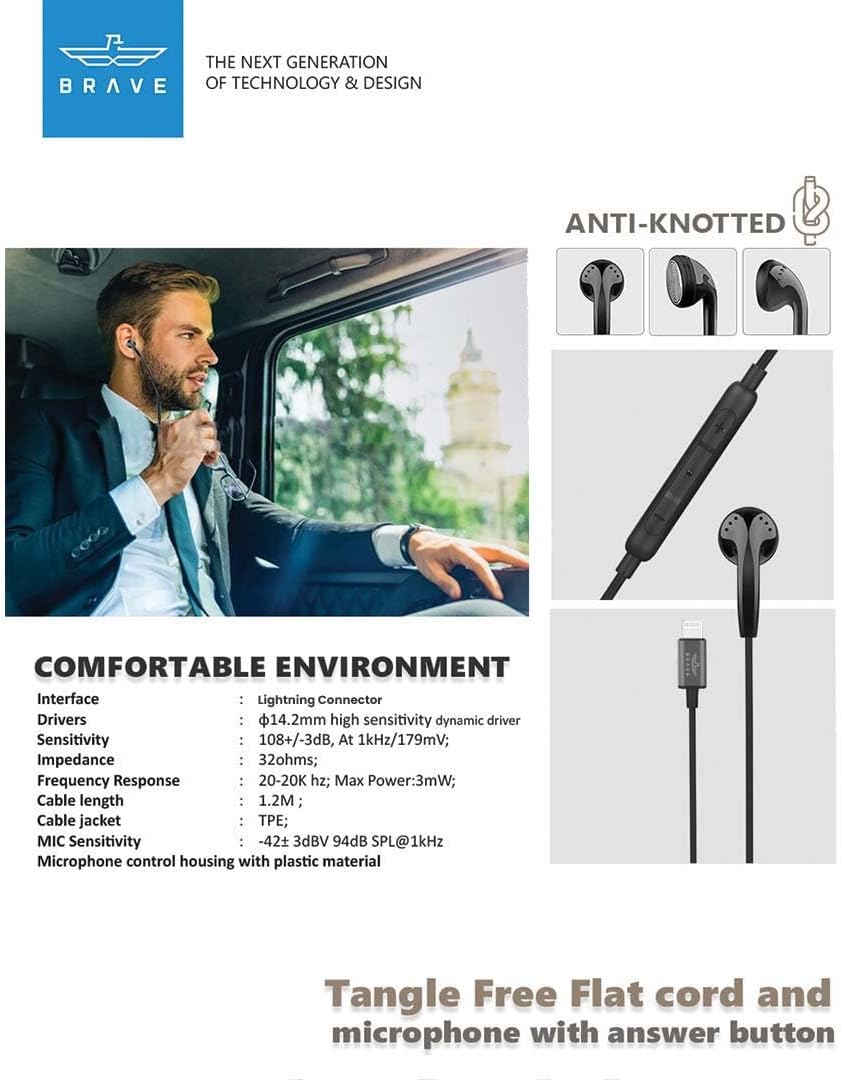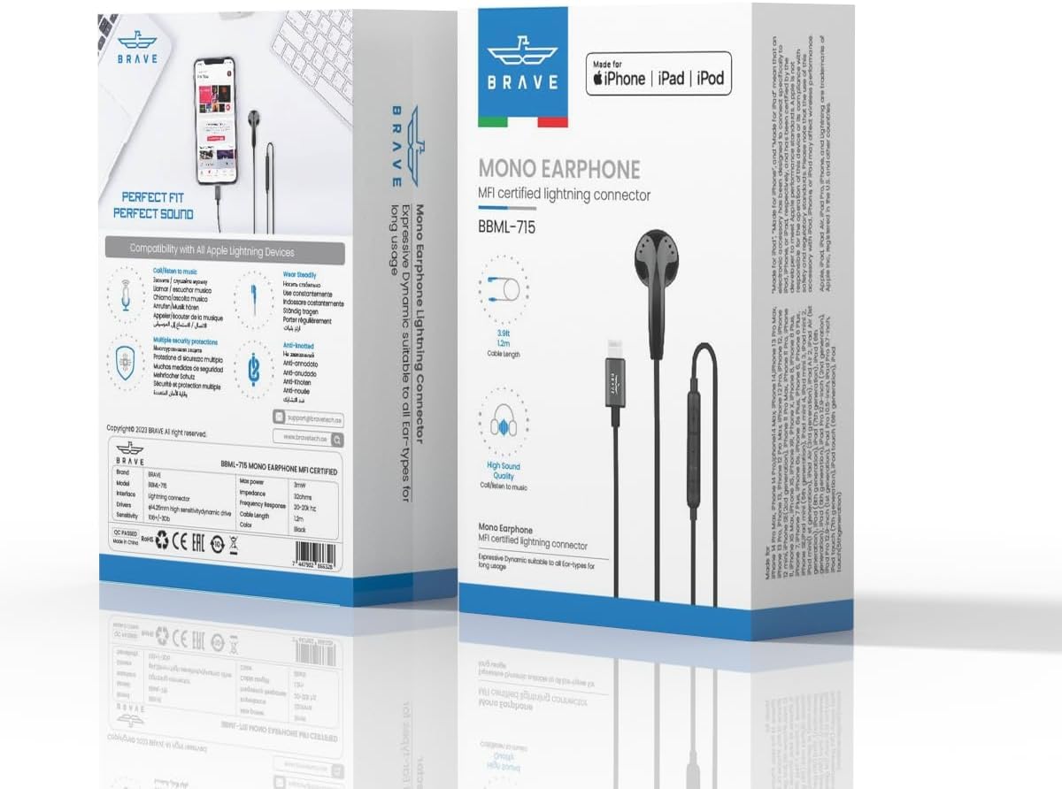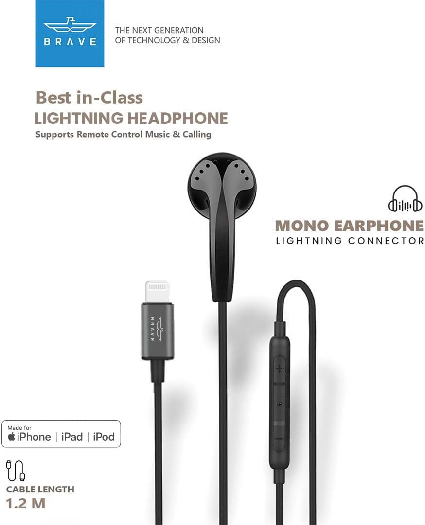 The BRAVE Mono Earphone is an Apple MFi-certified in-ear headset designed for iPhones with a Lightning port. It features a 1.2-meter cable with an inline microphone and volume controls, allowing for easy management of calls and music. Its ergonomic design ensures comfort during extended use, making it suitable for daily activities.