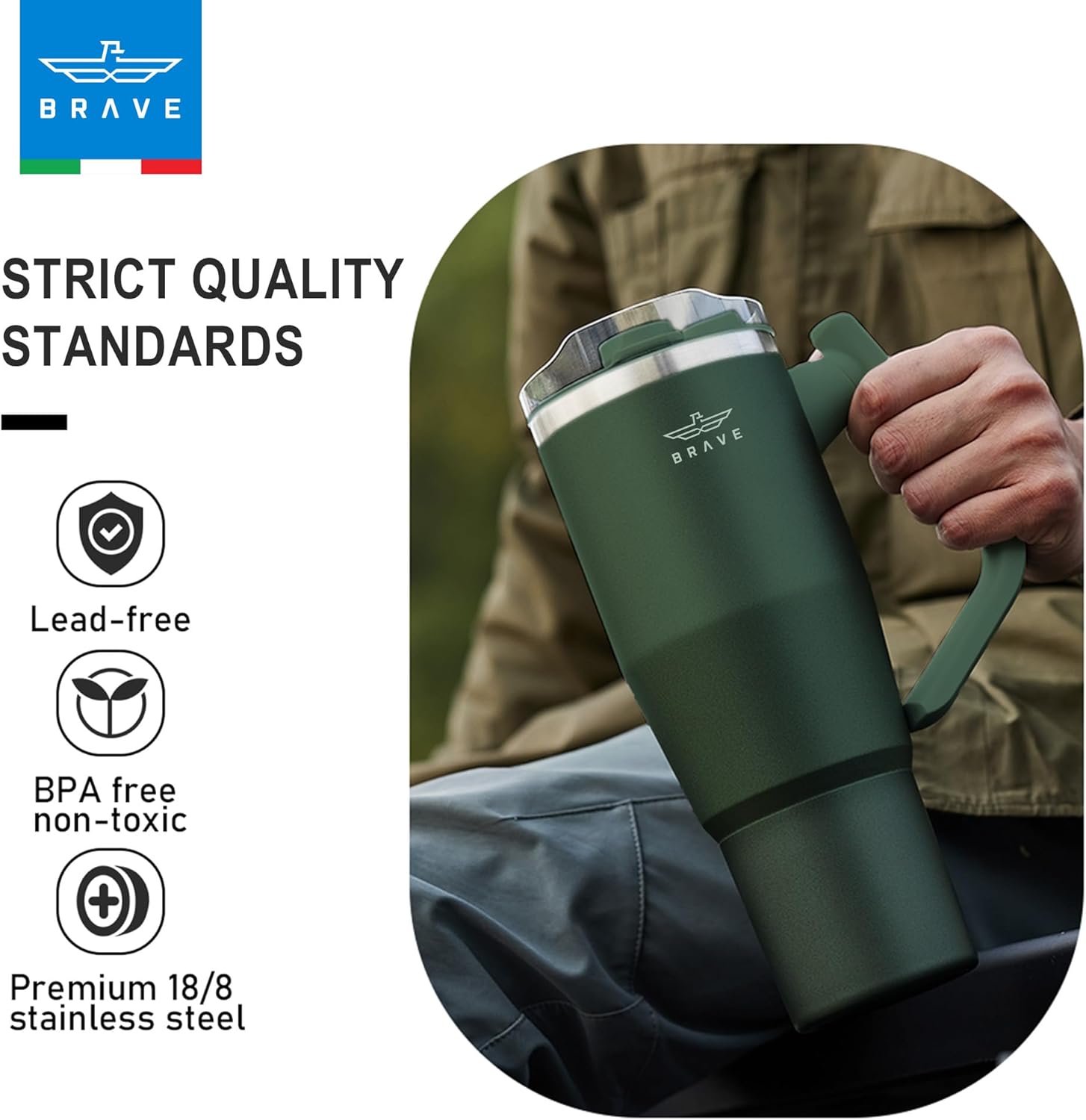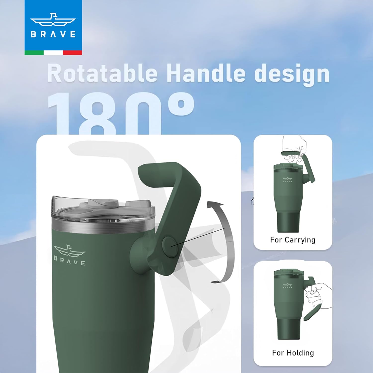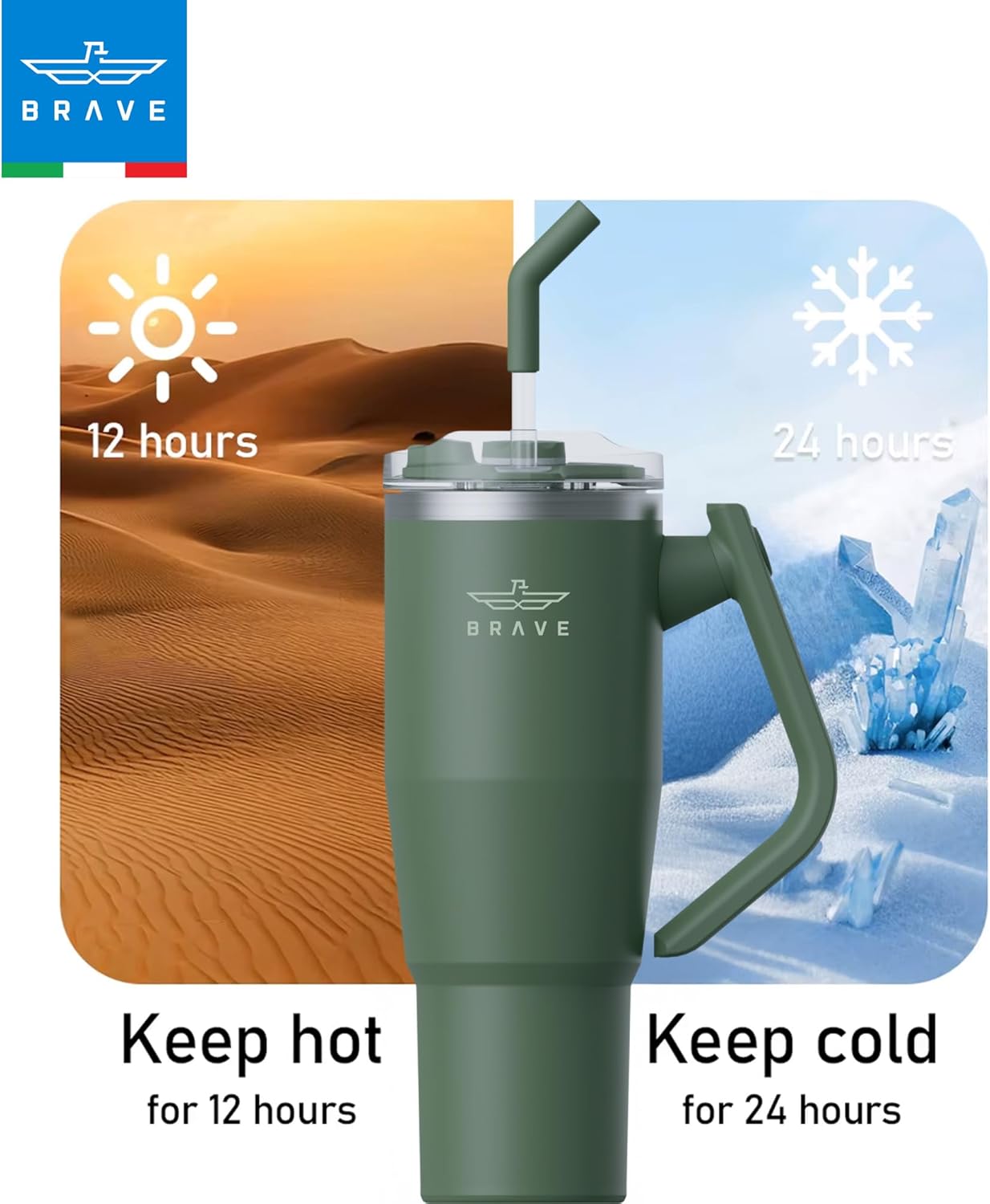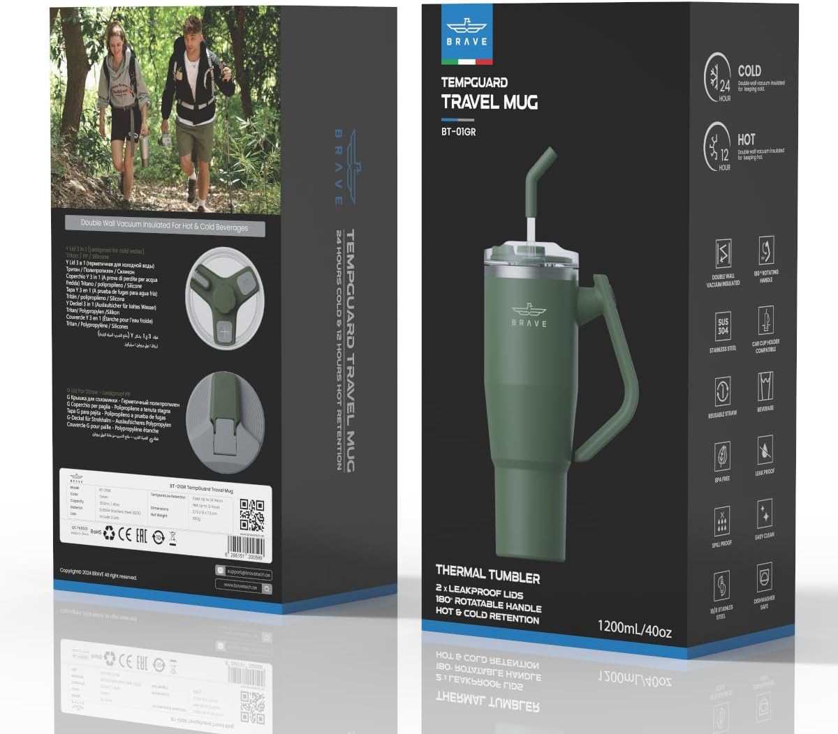 The Brave TempGuard 40oz (1200ml) Thermal Tumbler is a high-capacity, vacuum-insulated stainless steel tumbler designed to keep drinks cold for up to 24 hours or hot for up to 12 hours. It features dual leak-proof lids with a reusable straw, a 180° rotating handle for easy carrying, and a slim base that fits most car cup holders. Made from durable SUS304 stainless steel, it is sweat-proof, dishwasher-safe, and ideal for commuting, workouts, or outdoor activities, offering convenience and reliable temperature retention on the go.