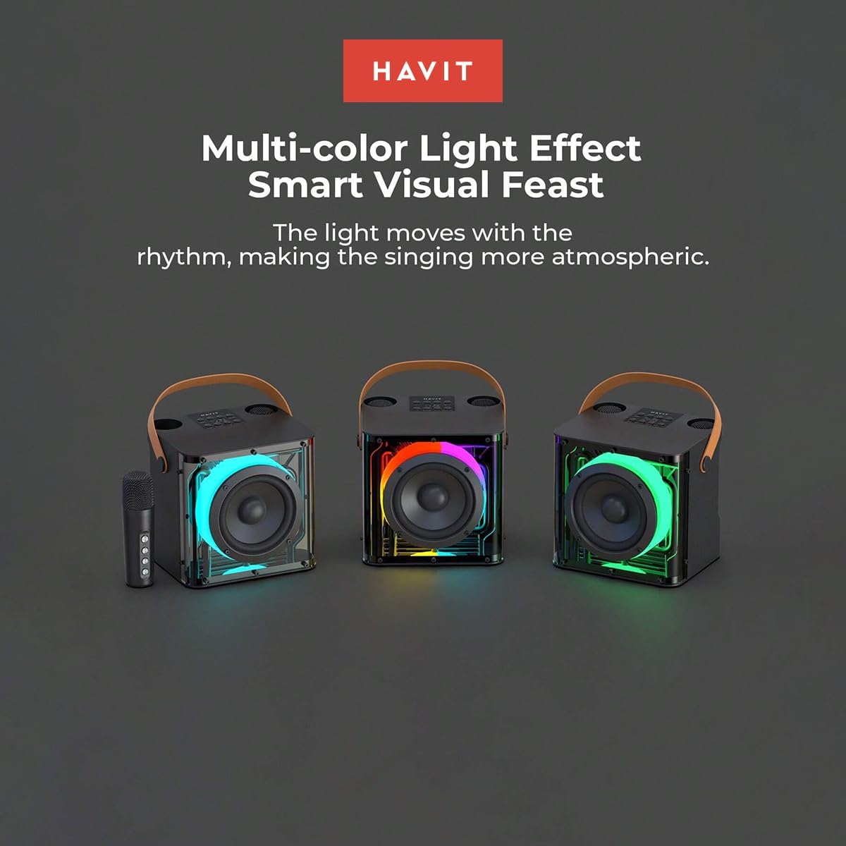 15W portable speaker with dual wireless microphones, fun voice effects, dynamic RGB lights, 8-hour playtime, and multiple inputs (BT 5.3, USB, TF, AUX, TWS) for party-ready sound anywhere.
