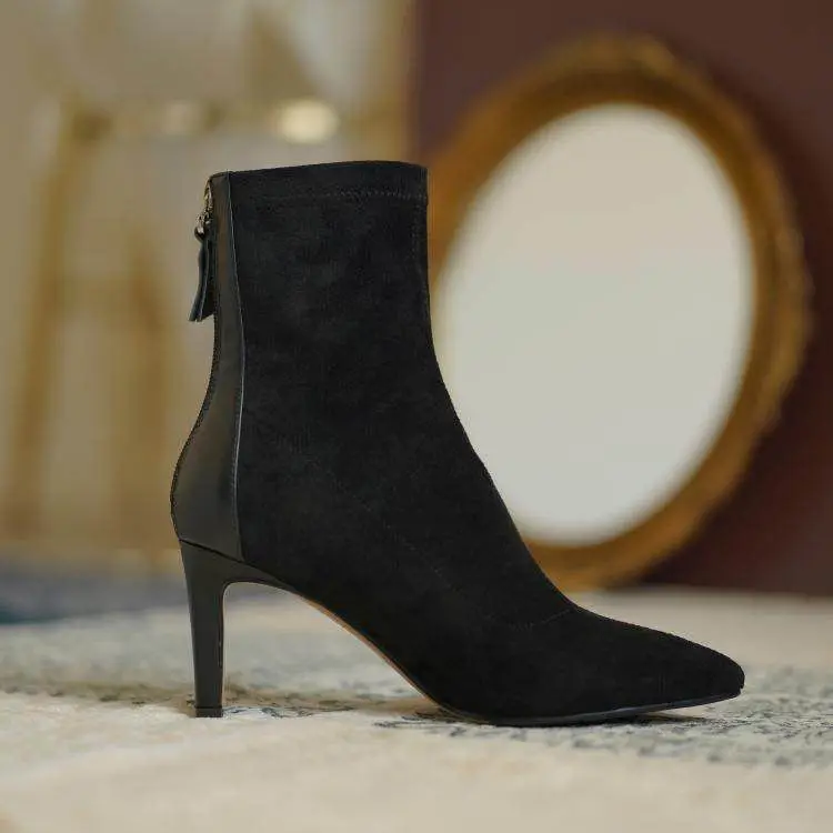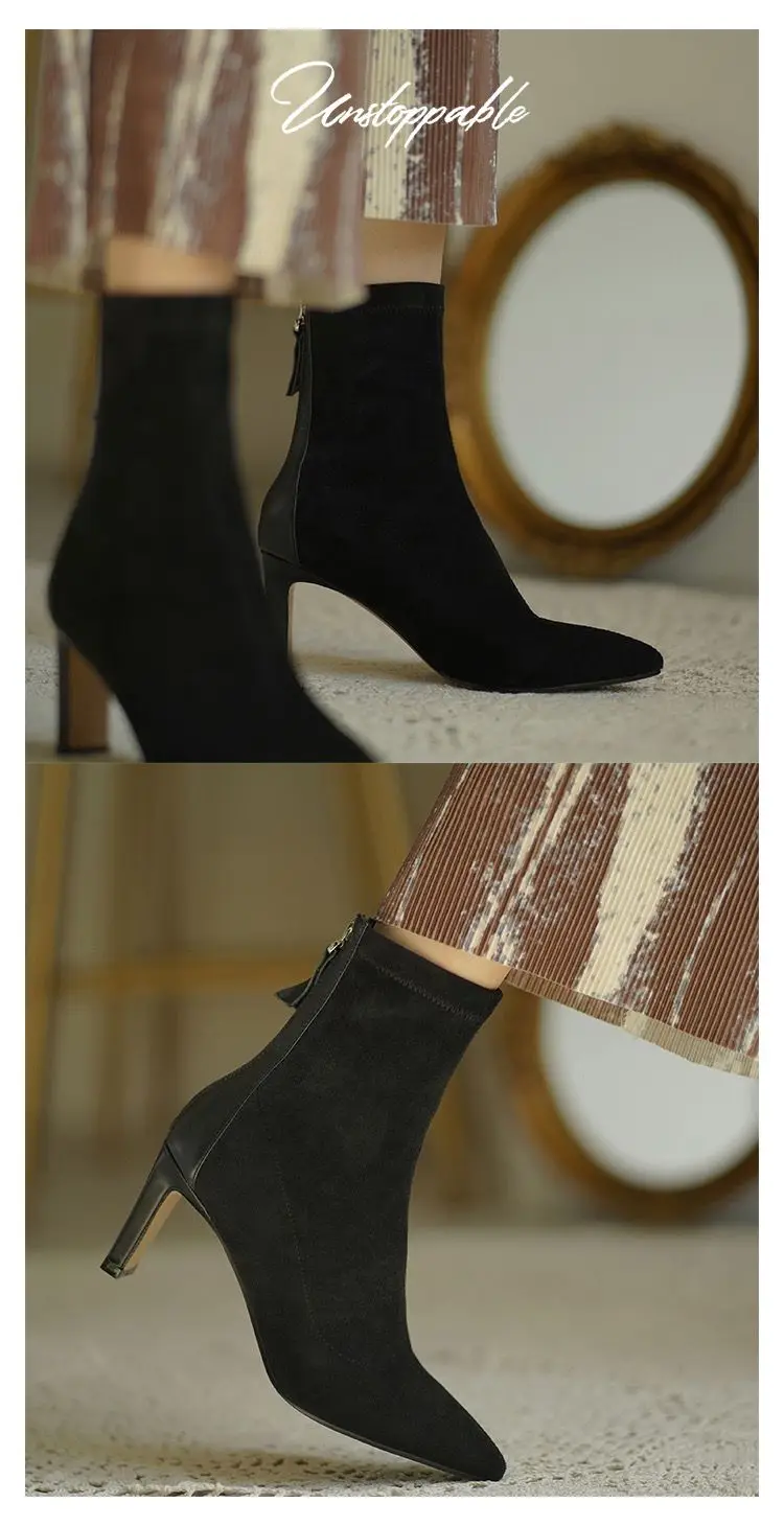 High Heel Suede Boots Women's Korean Style Mid Heel Stretch Thin Boots Pointed Toe