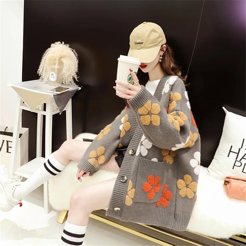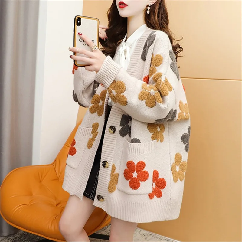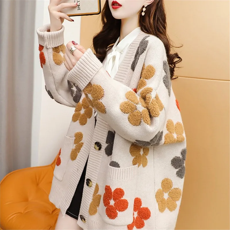 Knit Cardigan Women Sweater Print Floral V Neck Long Sleeved Sweaters