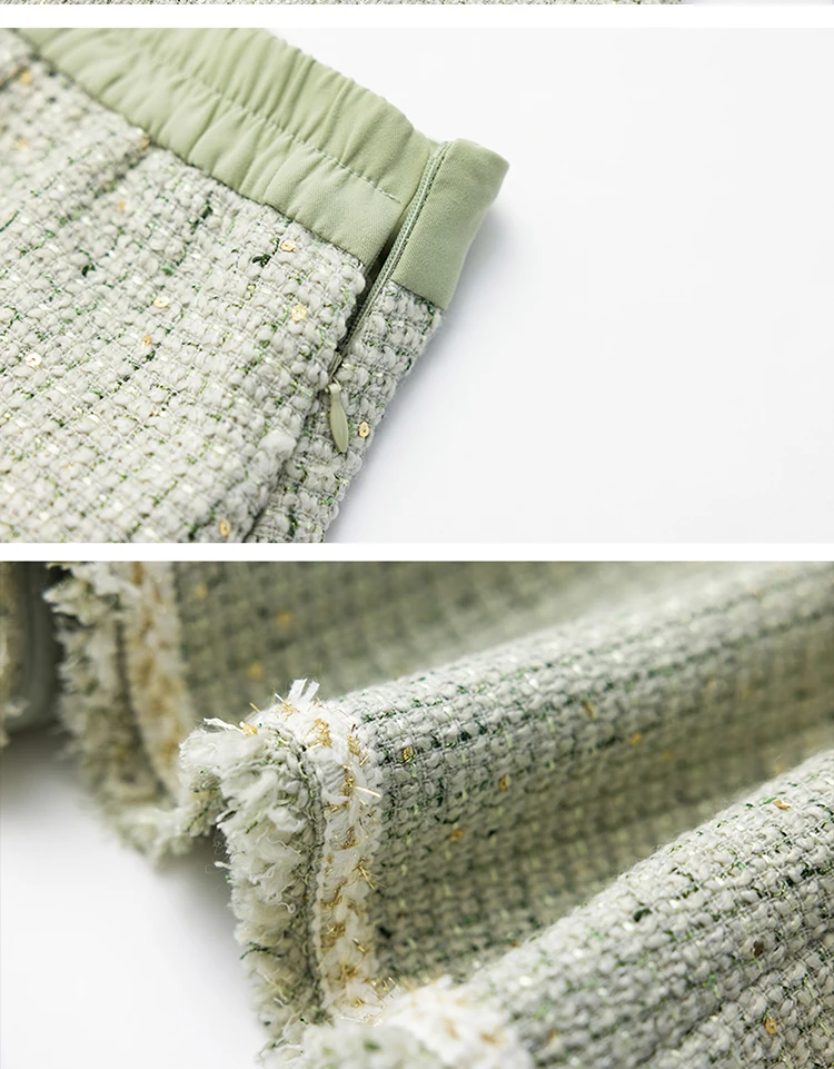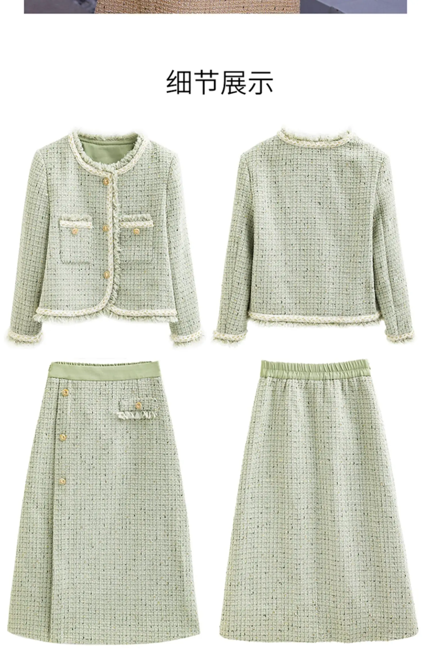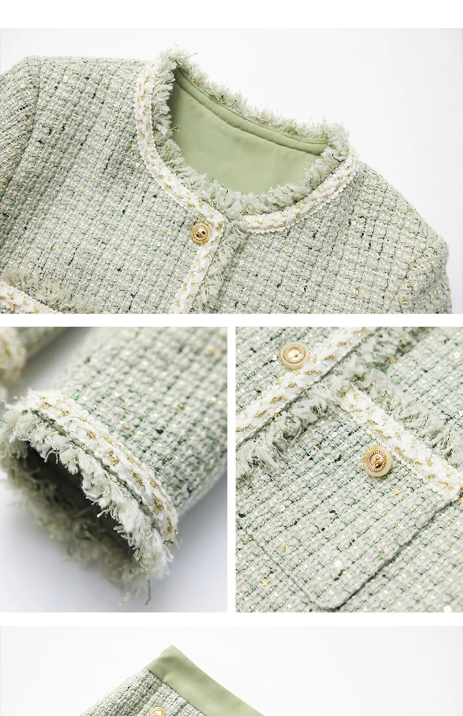 Elegant Tweed Tassel Long Sleeve Jacket Coat + High Waist Skirt