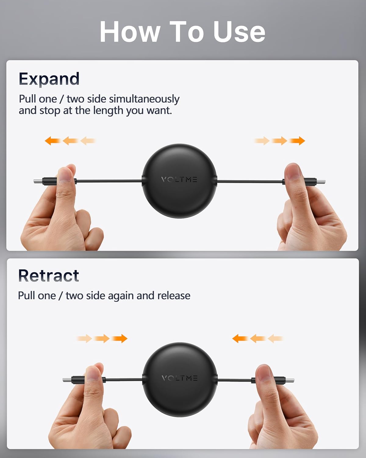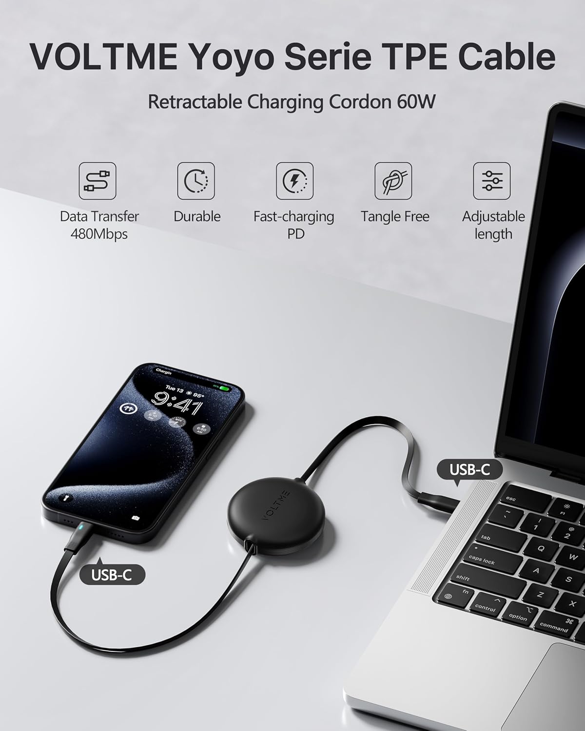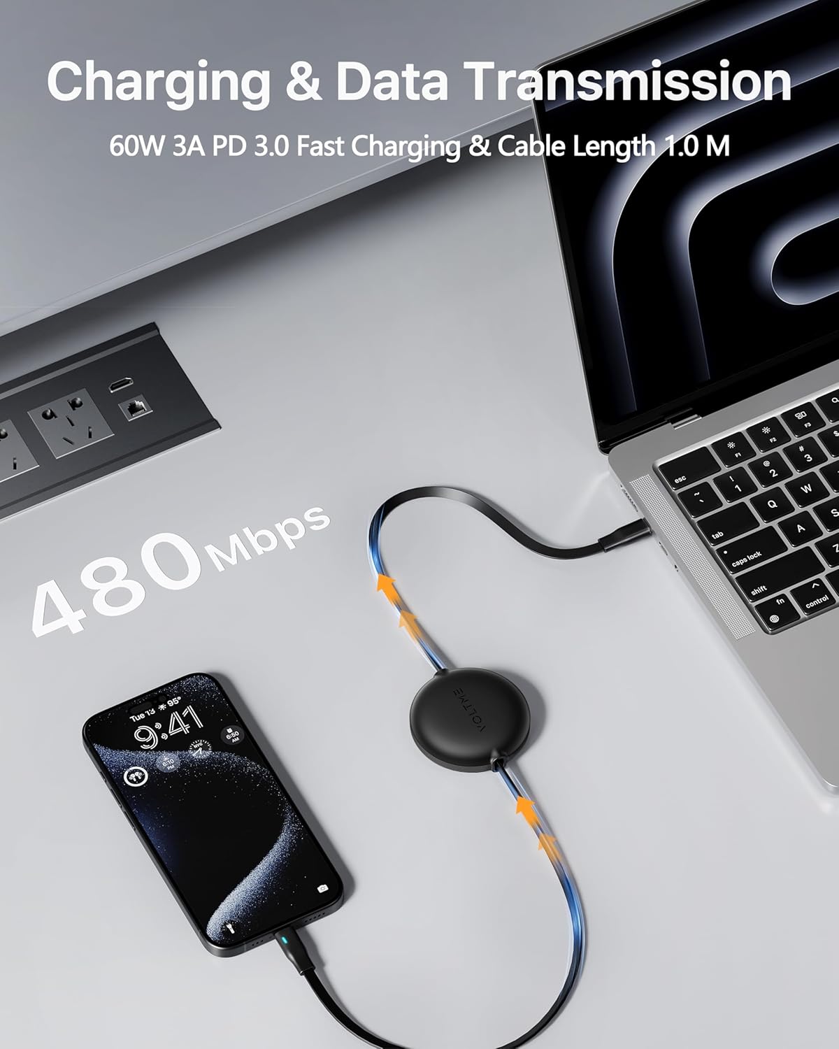 Compact USB-C to USB-C cable with 60W fast charging, 480Mbps data transfer, and adjustable retractable length for tangle-free use. Durable, safe, and ideal for travel.